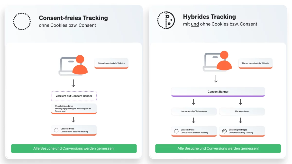 Dadurch ist eine bestmögliche Datenqualität unabhängig von Einwilligungen möglich in Harmonie mit allen rechtlichen Anforderungen. Dies ist die Grundlage für effiziente Website- und Kampagnen-Steuerung. Das wiederum führt zu höheren Umsätzen und gestiegenen Marketing-Erfolgen (ROAS). Rechtliche Risiken werden vermieden und das Vertrauen der Kunden und Interessenten gestärkt.